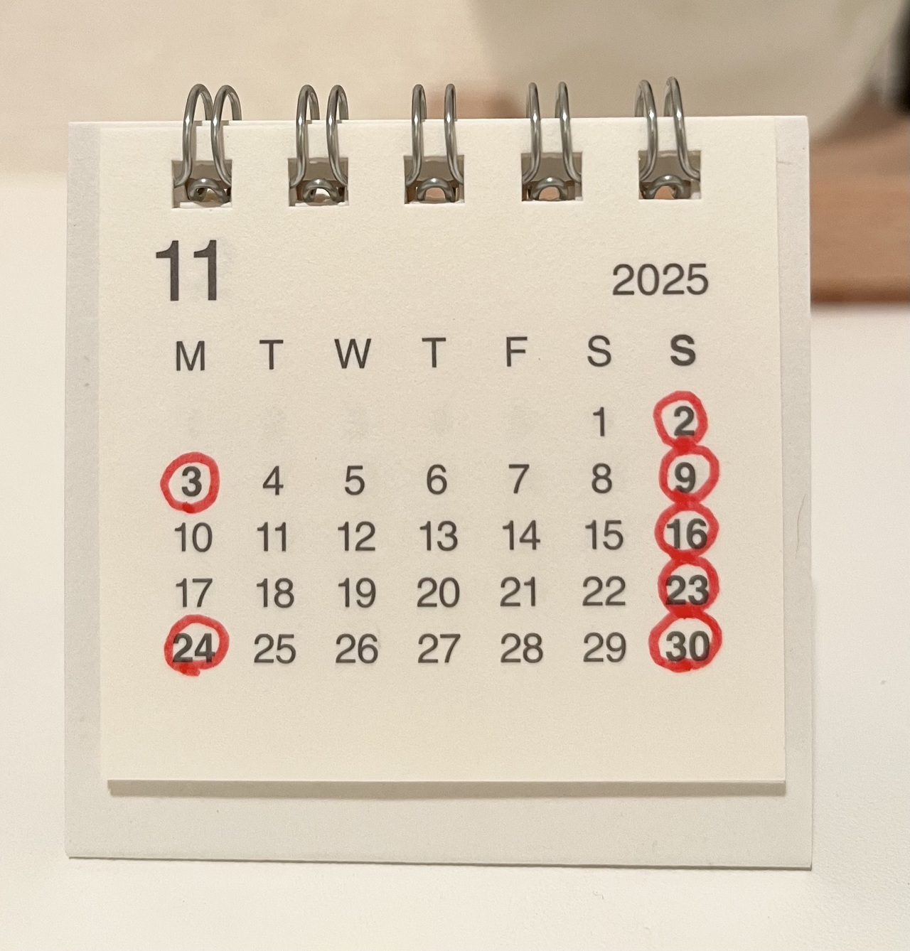 11月は、3日(日)、4日(月)、10日(日)、17日(日)、23日(土)、24日(日)がお休みとなります。