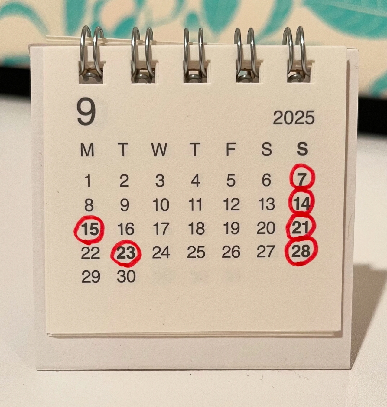 9月は、1日(日)、8日(日)、15日(日)、16日(月)、22日(日)、23日(月)、29日(日)がお休みとなります。